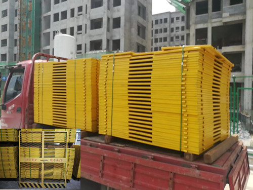 門面設(shè)計優(yōu)點:門面采用小孔鋼板網(wǎng)或電焊網(wǎng)片與鋼板組合構(gòu)成。一方面可以防止等候人員伸手開門,又便于人貨電梯操作人員觀察樓內(nèi)情況,利于樓內(nèi)外雙方工作人員溝通交流。高強冷軋鋼板同時也是小型汽車普遍采用的材料,可以抗擊300kg以上的沖擊力。并且噴涂警示語和擋腳警示線,對工地文明施工形象顯著提升。